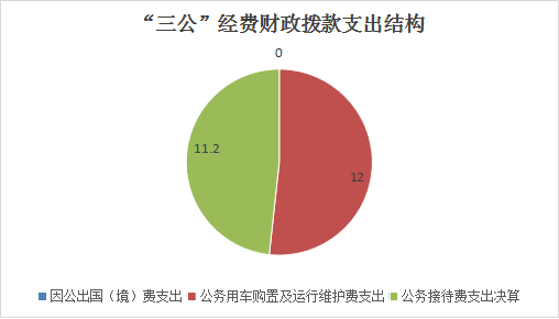 2022年“三公”经费财政拨款支出决算中,因公出国(境)费支出决算0万元,占0%;公务用车购置及运行维护费支出决算12万元,占51.7%;公务接待费支出决算11.2万元,占48.3%。具体情况如下: