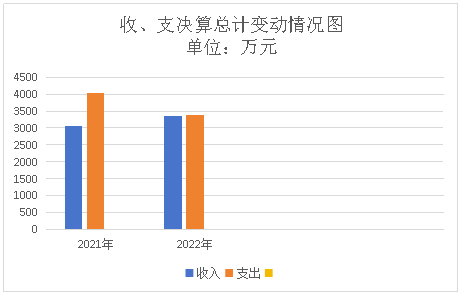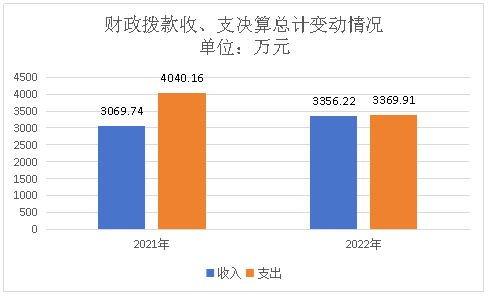 2022年度收、支总计3,369.91万元。与2021年相比,收入增加286.48万元,增加9.33%,主要原因是2022年编制内实有人数增加,导致人员类经费收入增加;支出总计减少670.25万元,下降16.59%。主要变动原因是2022年各项基本支出、项目类支出少于2021年的各项基本支出、项目类支出。