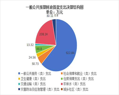 2022年一般公共预算财政拨款支出999.39万元,主要用于以下方面:一般公共服务支出622.84万元,占62.32%;社会保障和就业支出50.73万元,占5.08%;卫生健康支出24.56万元,占2.46%;住房保障支出48.80万元,占4.88%,交通运输支出13.32万元,占1.33%;农林水支出208.24万元,占20.84%;灾害防治及应急管理支出30.11万元,占3.01%;城乡社区支出0.80万元,占0.08%。