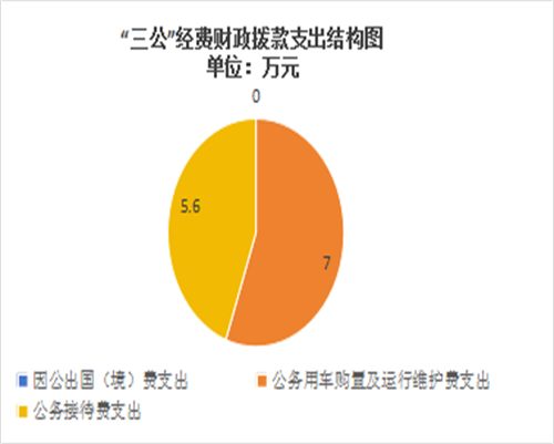 2022年“三公”经费财政拨款支出决算中,因公出国(境)费支出决算0万元,占0%;公务用车购置及运行维护费支出决算7万元,占56%;公务接待费支出决算5.6万元,占44%。具体情况如下: