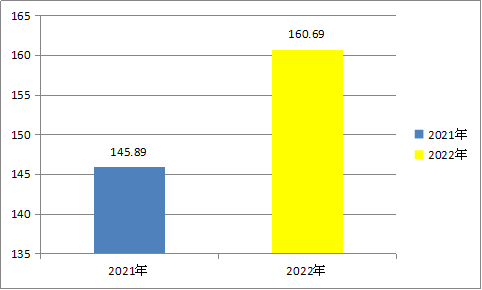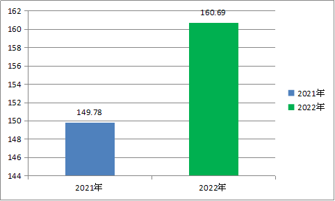 2022年一般公共预算支出决算数为160.69万元,2021年收入1,45.89万元年相比增加147,997.22元。增加10.14%。2022年支出1,606,853.22元,2021年支出1,497,813.13元与上年相比增加109,040.09元,增加7.28%元。(可用柱形图或折线图)。