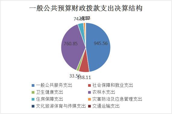 2023年度一般公共预算财政拨款支出1,983.39万元,主要用于以下方面:一般公共服务支出945.56万元,占47.67%;文化旅游体育与传媒支出3.53万元,占0.18%;社会保障和就业支出138.11万元,占6.96%;卫生健康支出33.56万元,占1.69%;住房保障支出74.81万元,占3.77%;农林水支出760.85,占38.36%;交通运输支出2.1万元,占0.11%;灾害防治及应急管理支出24.87,占1.25%。