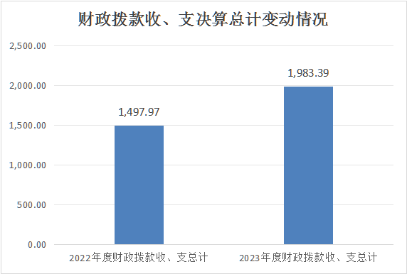 2023年度财政拨款收、支总计均为1,983.39万元。与2022年度相比,财政拨款收、支总计各增加485.42万元,增长32.41%。主要变动原因是新进人员、人员调资追加,项目增加,项目资金支出增加。