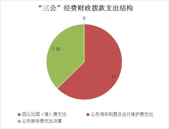 2023年度“三公”经费财政拨款支出决算中,因公出国(境)费支出决算0万元,占0%;公务用车购置及运行维护费支出决算12万元,占62.63%;公务接待费支出决算7.16万元,占37.37%。具体情况如下: