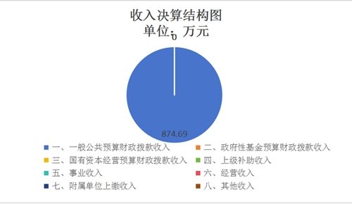 2023年度本年收入合计874.69万元,其中:一般公共预算财政拨款收入874.69万元,占100%;政府性基金预算财政拨款收入0万元,占0%;国有资本经营预算财政拨款收入0万元,占0%;上级补助收入0万元,占0%;事业收入0万元,占0%;经营收入0万元,占0%;附属单位上缴收入0万元,占0%;其他收入0万元,占0%。