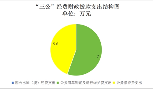 2023年度“三公”经费财政拨款支出决算中,因公出国(境)费支出决算0万元,占0%;公务用车购置及运行维护费支出决算7万元,占55.6%;公务接待费支出决算5.6万元,占44.4%。具体情况如下: