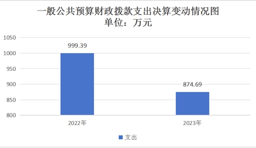 2023年度一般公共预算财政拨款支出874.69万元,占本年支出合计的100%。与2022年度相比,一般公共预算财政拨款支出减少124.7万元,下降12.5%。主要变动原因是2023年各项基本支出、项目类支出少于2022年的各项基本支出、项目类支出。