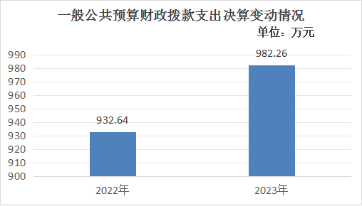 2023年度一般公共预算财政拨款支出982.26万元,占本年支出合计的100%。与2022年度相比,一般公共预算财政拨款支出增加49.62万元,增长5.3%。主要变动原因是职工保险缴费基数增长、项目资金增加。