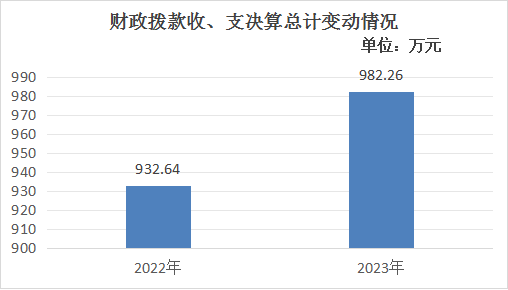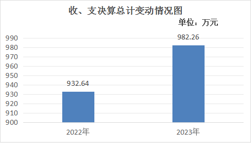 2023年度收、支总计均为982.26万元。与2022年度相比,收、支总计各增加49.62万元,增长5.3%。主要变动原因是职工保险缴费基数增长、项目资金增加。