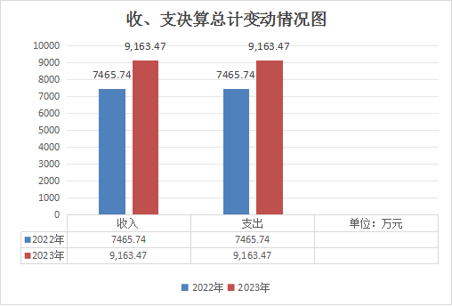 2023年度收、支总计均为9163.47万元。与2022年度相比,收、支总计各增加1697.73万元,增长23%。主要变动原因是项目资金增加。