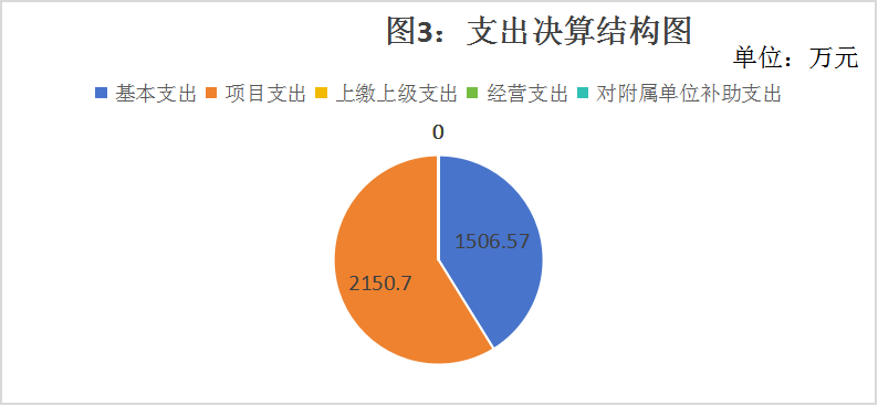 2023年度本年支出合计3657.27万元,其中:基本支出1506.57万元,占41.2%;项目支出2150.7万元,占58.8%;上缴上级支出0万元,占0%;经营支出0万元,占0%;对附属单位补助支出0万元,占0%。