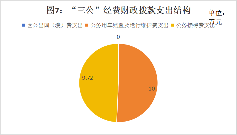 2023年度“三公”经费财政拨款支出决算中,因公出国(境)费支出决算0万元,占0%;公务用车购置及运行维护费支出决算10万元,占比50.7%;公务接待费支出决算9.72万元,占49.3%。具体情况如下: