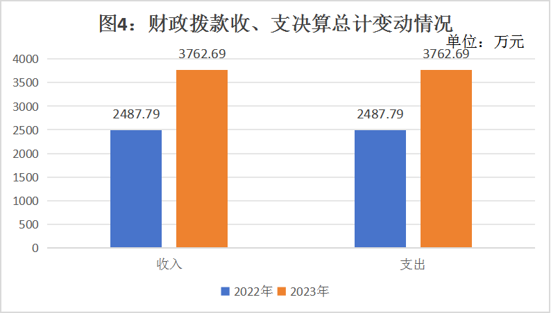 2023年度收、支总计均为3762.69万元。与2022年度相比,收、支总计各增加1274.9万元,增长51.2%。主要变动原因是增加重大项目:清江河水质保障工程项目。