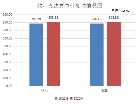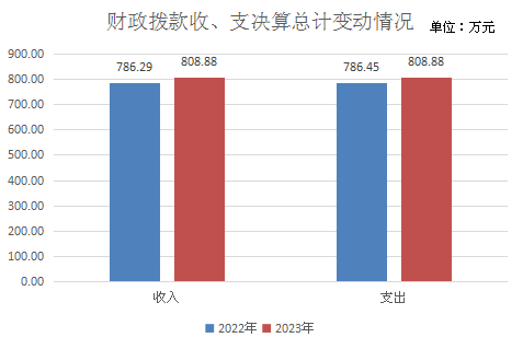 2023年度收、支总计均为808.88万元。与2022年度相比,收入总计增加22.59万元、支出总计增加22.43万元,分别增长2.9%、2.9%。主要变动原因是我单位编制内实有人数增加,导致人员基本支出及日常事务公用支出收支增加。