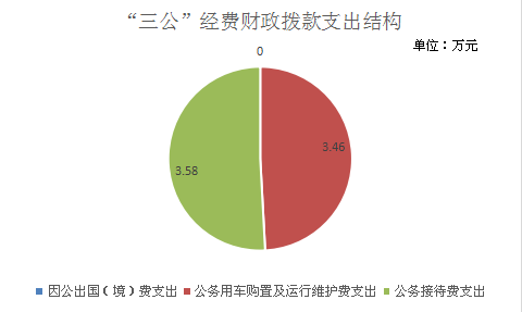 2023年度“三公”经费财政拨款支出决算中,因公出国(境)费支出决算0万元,占0%;公务用车购置及运行维护费支出决算3.46万元,占49.1%;公务接待费支出决算3.58万元,占50.9%。具体情况如下: