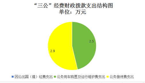 2023年度“三公”经费财政拨款支出决算中,因公出国(境)费支出决算0万元,占0%;公务用车购置及运行维护费支出决算2.5万元,占46.3%;公务接待费支出决算2.9万元,占53.7%。具体情况如下: