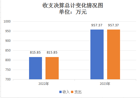 2023年度收、支总计均为957.37万元。与2022年度相比,收、支总计各增加141.52万元,增长17.34%。主要变动原因是职工保险缴费基数增长、项目资金增加。
