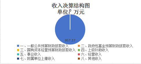 2023年度本年收入合计957.37万元,其中:一般公共预算财政拨款收入957.37万元,占100%;政府性基金预算财政拨款收入0万元,占0%;国有资本经营预算财政拨款收入0万元,占0%;上级补助收入0万元,占0%;事业收入0万元,占0%;经营收入0万元,占0%;附属单位上缴收入0万元,占0%;其他收入0万元,占0%。